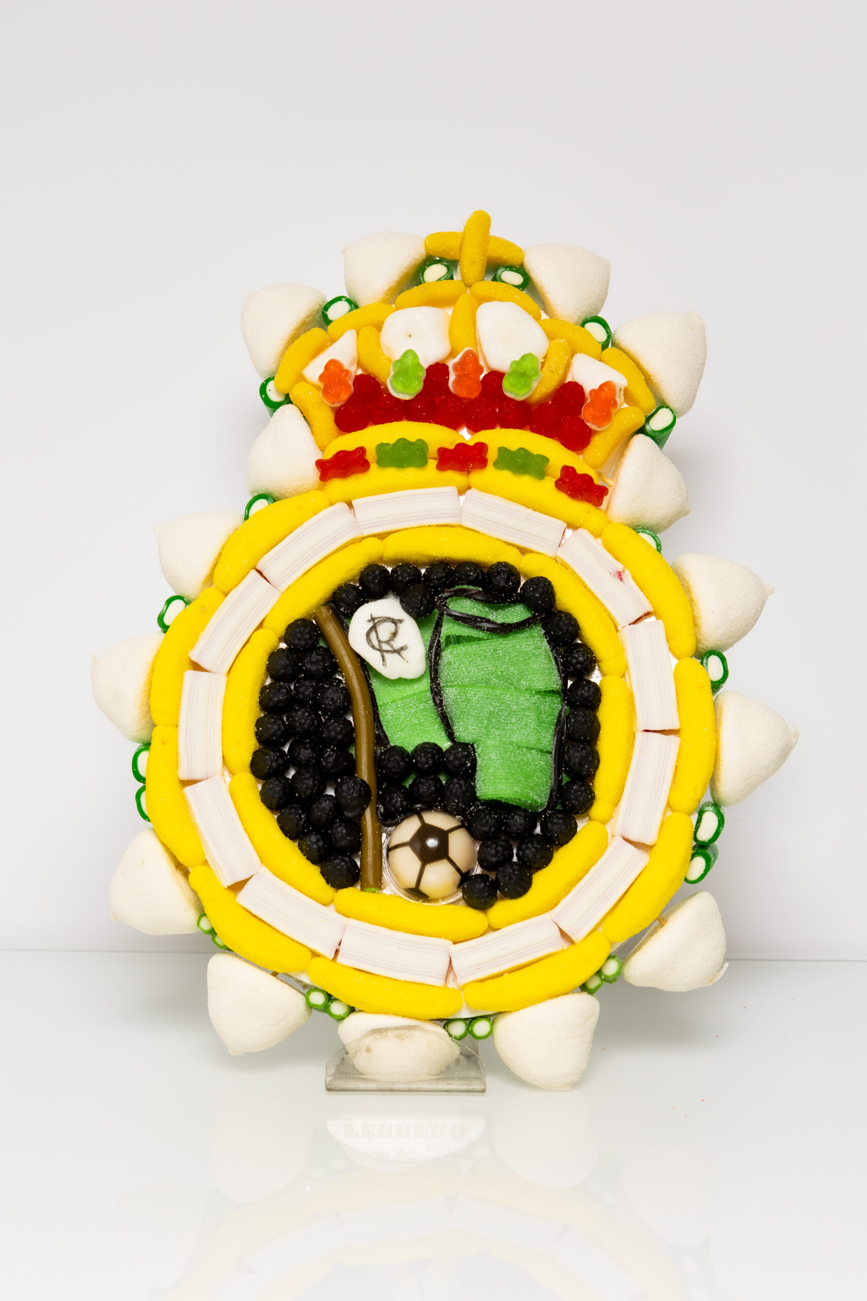 Imagina una tarta vibrante decorada con gominolas de todos los colores, perfecta para recrear el icónico escudo de tu club de fútbol predilecto. Este manjar no solo se ve bien, ¡sabe espectacular! Ideal para cualquier evento deportivo o cumpleaños.
